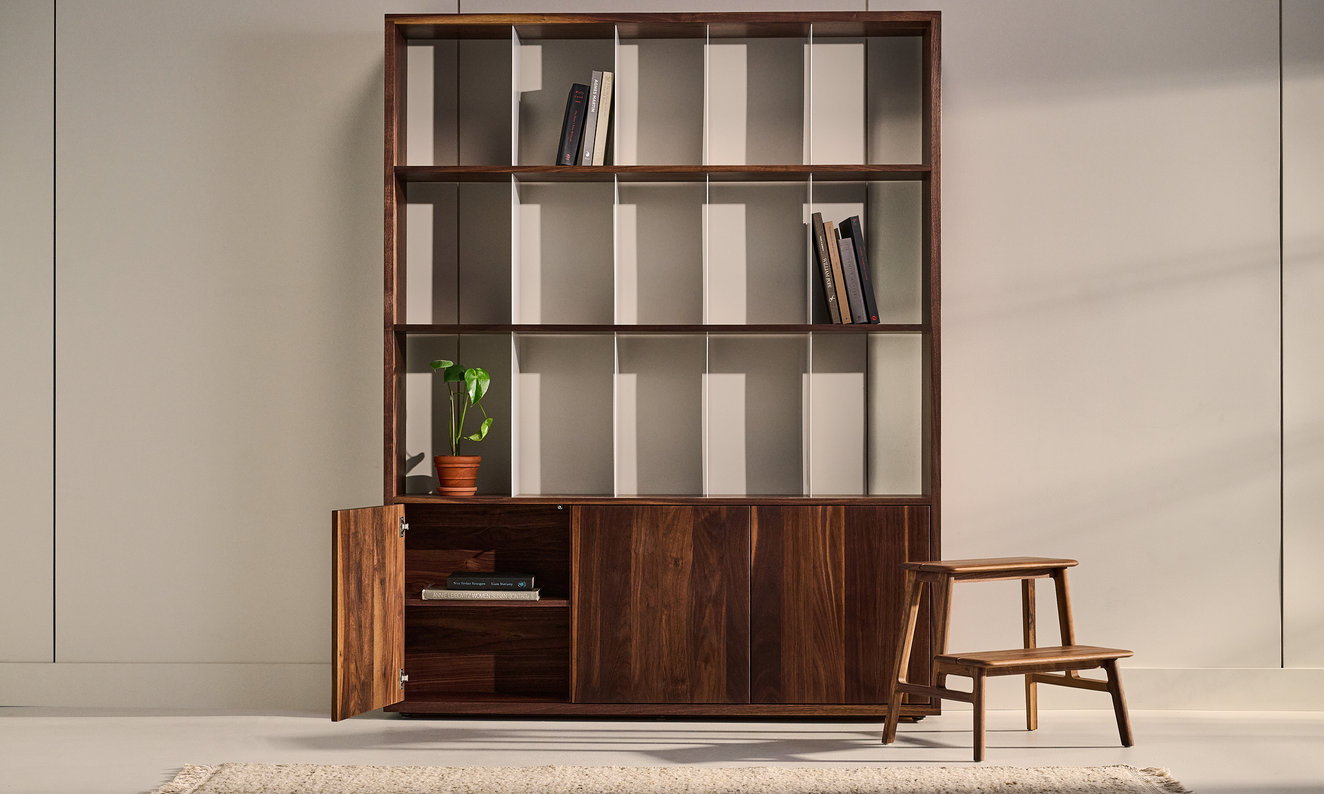 The S304R is the newest edition to our bookshelf family. This multifunctional bookcase features solid wood shelves, custom metal dividers, and convenient closed-door storage at the base.  The unit is also available in a lowtall and standard version.