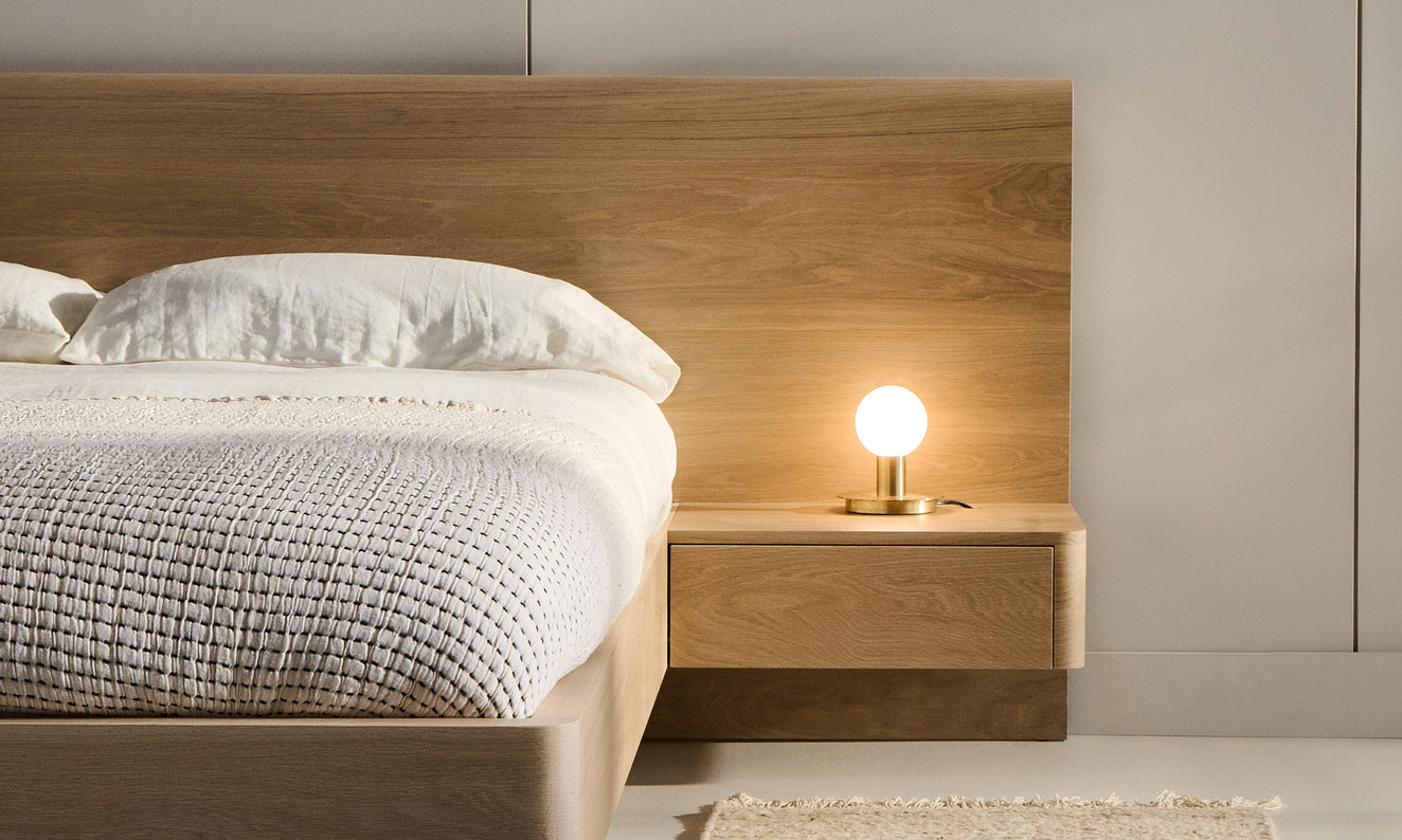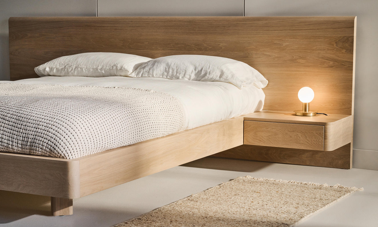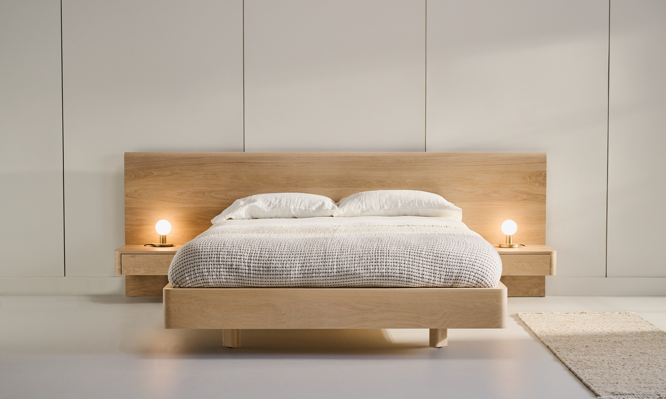 The B108 is a minimalist bed with integrated side tables and a low-profile, full-width headboard. The impressive headboard anchors the bed and creates a floating effect for the base and handy side tables.