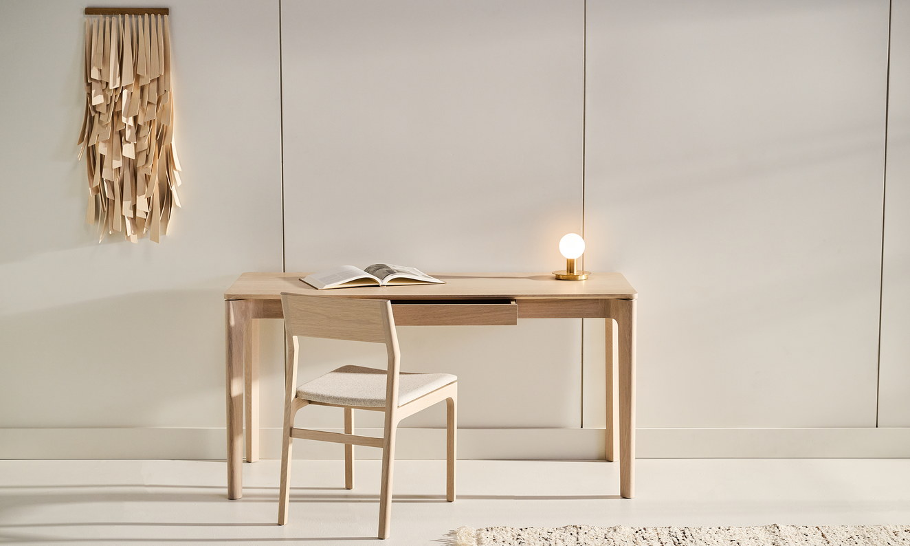 The T408 writing desk is elegantly sculpted with a practical pencil drawer tucked within the inset apron. The desktop is available in a selection of different wood species and various finishes.