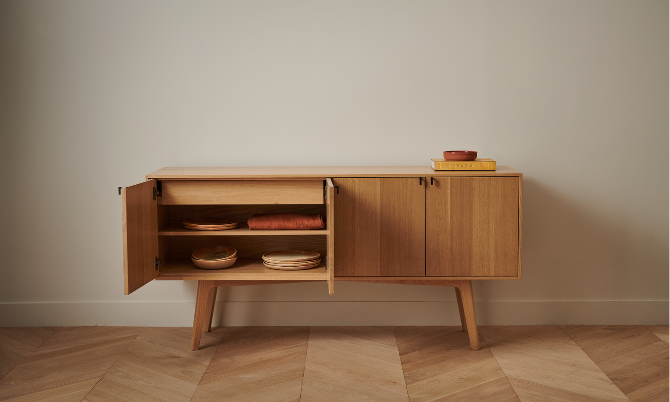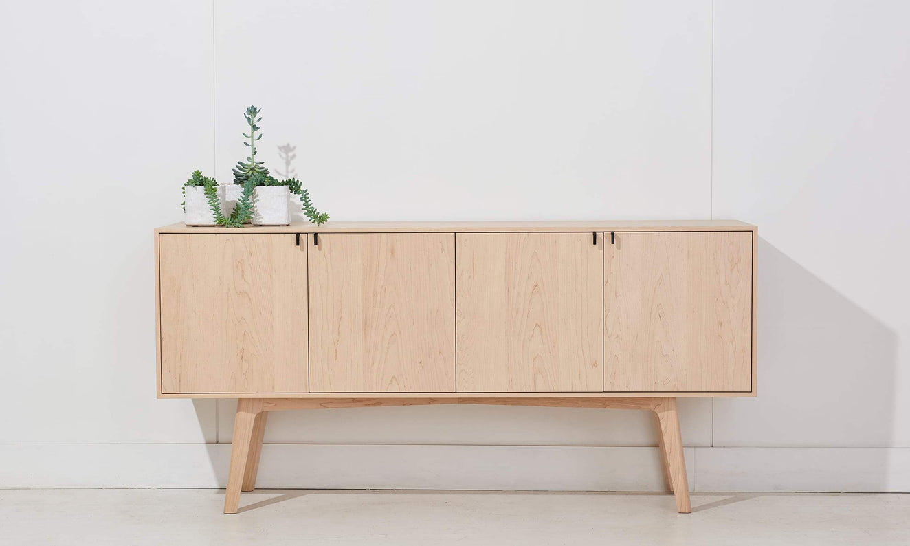 The S404 is an elegant buffet that borrows from mid-century design. The flat panel doors with custom pulls open to reveal two interior drawers and shelving. This highly customizable furniture piece adapts easily to different environments.