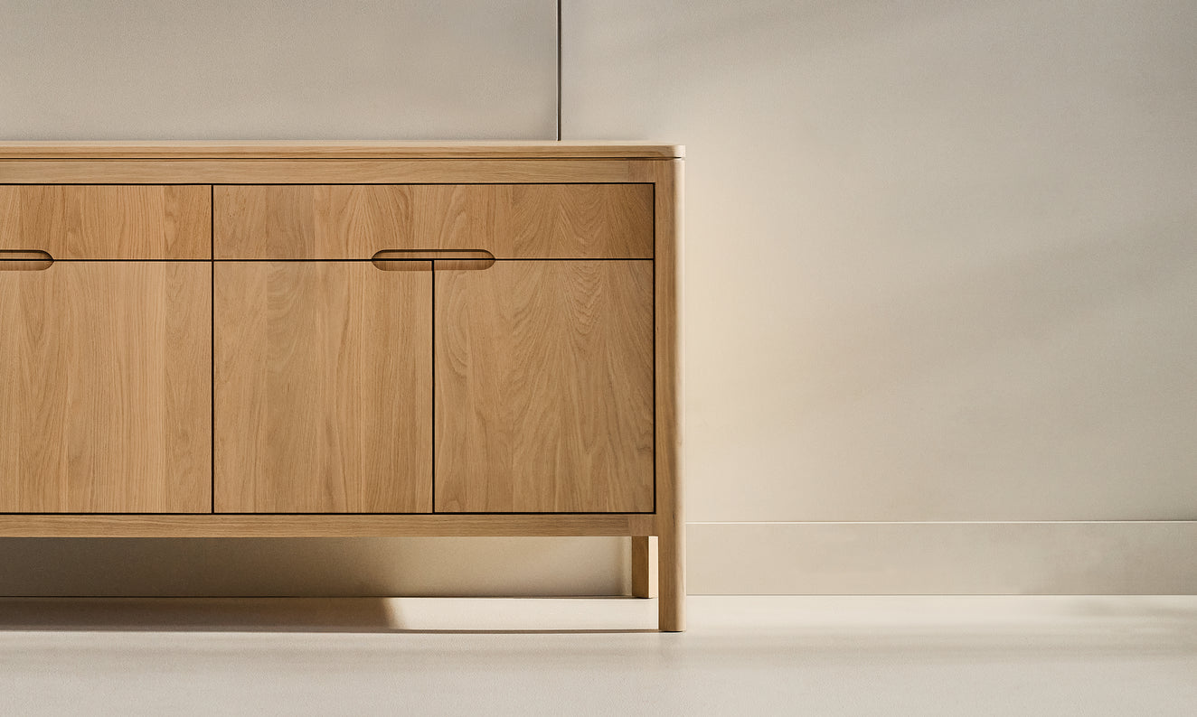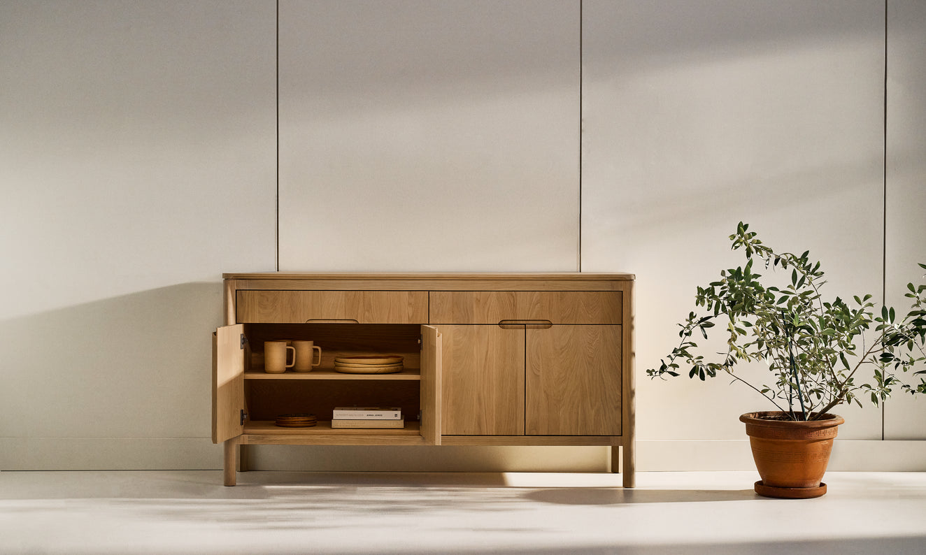 The S405 is a beautiful buffet with two small but practical dovetail drawers, integrated flush handles and adjustable interior shelves for extra storage.
