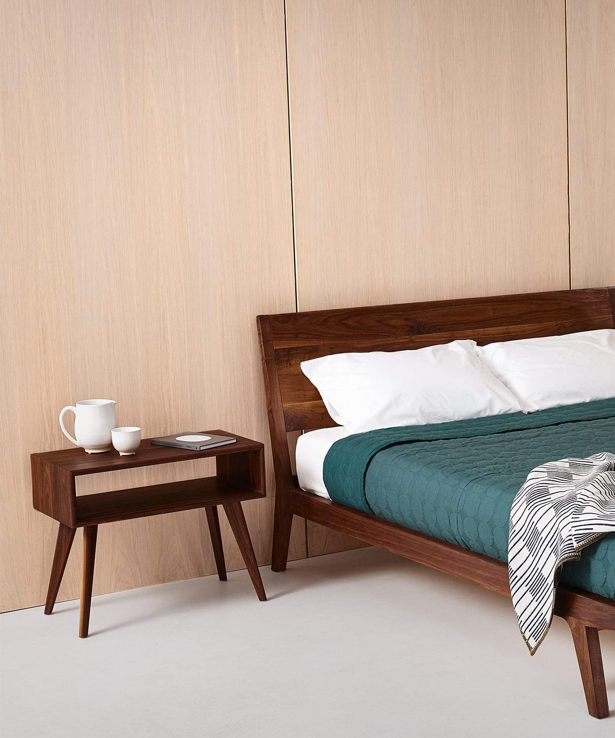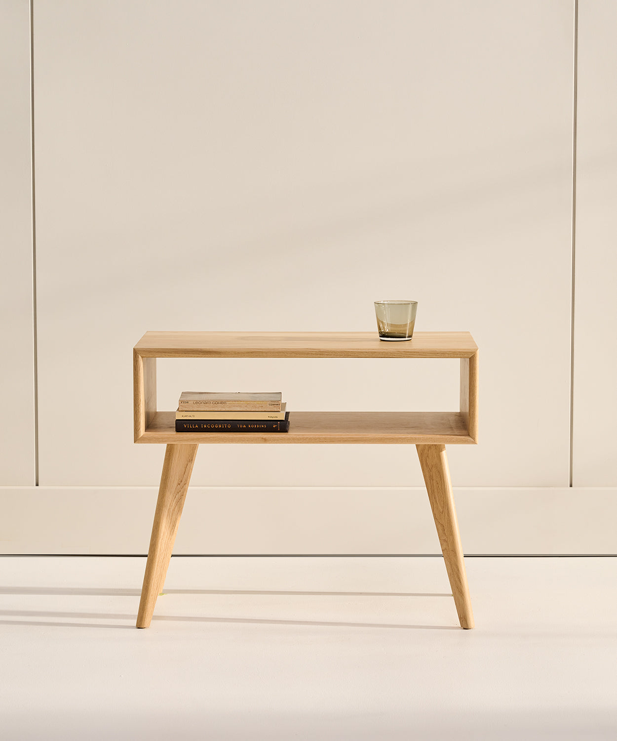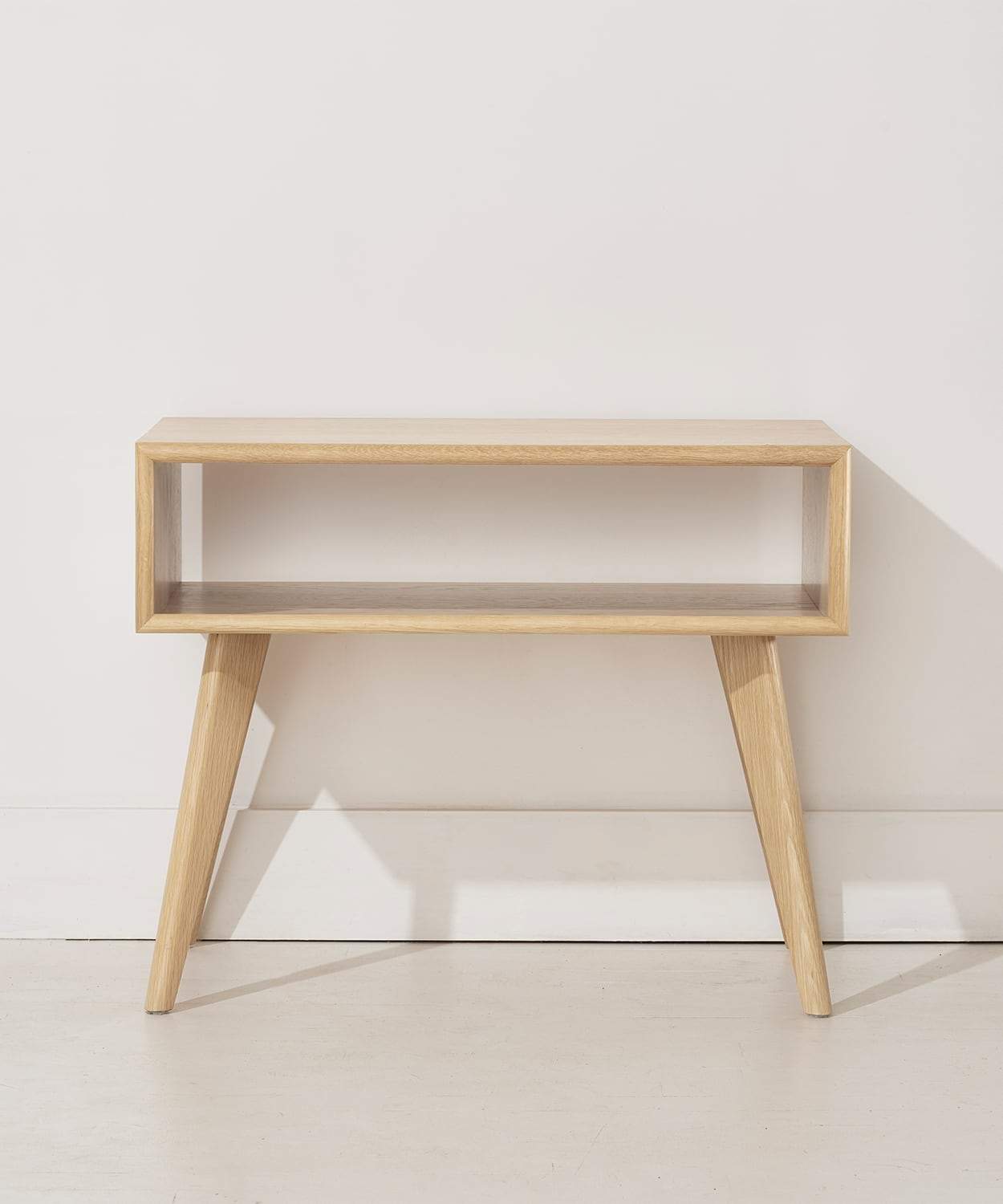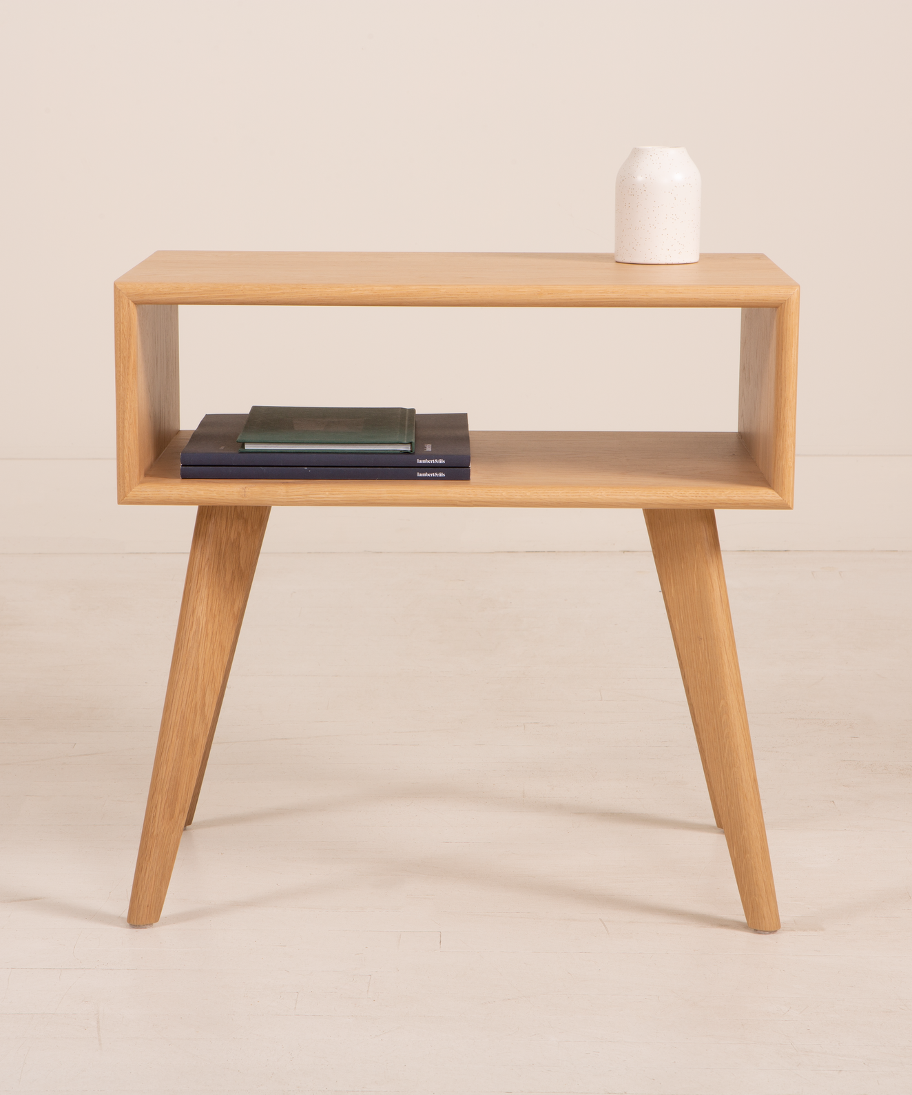 The T313 is a mid-century-inspired bedside table that prioritizes practicality with its handy open storage section. A versatile piece that can serve as a side table, it is available in two versions - a spacious 26" and a compact 22" version.