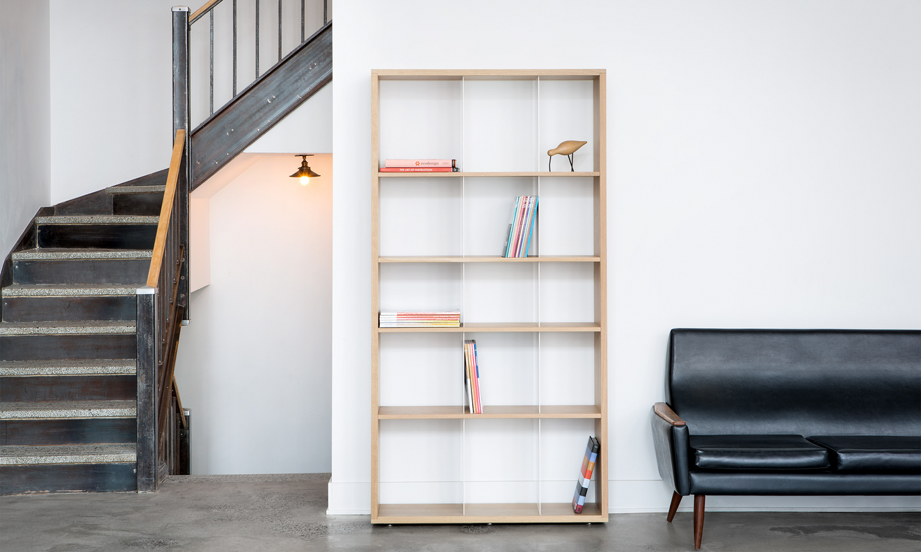 The  S304T is a narrow open shelving solution. The structured wood frame combines solid wood shelves and lacquered metal dividers, providing balance and refinement—a versatile piece used as a display unit or bookcase. The unit is also available in our original standard size and a low version.